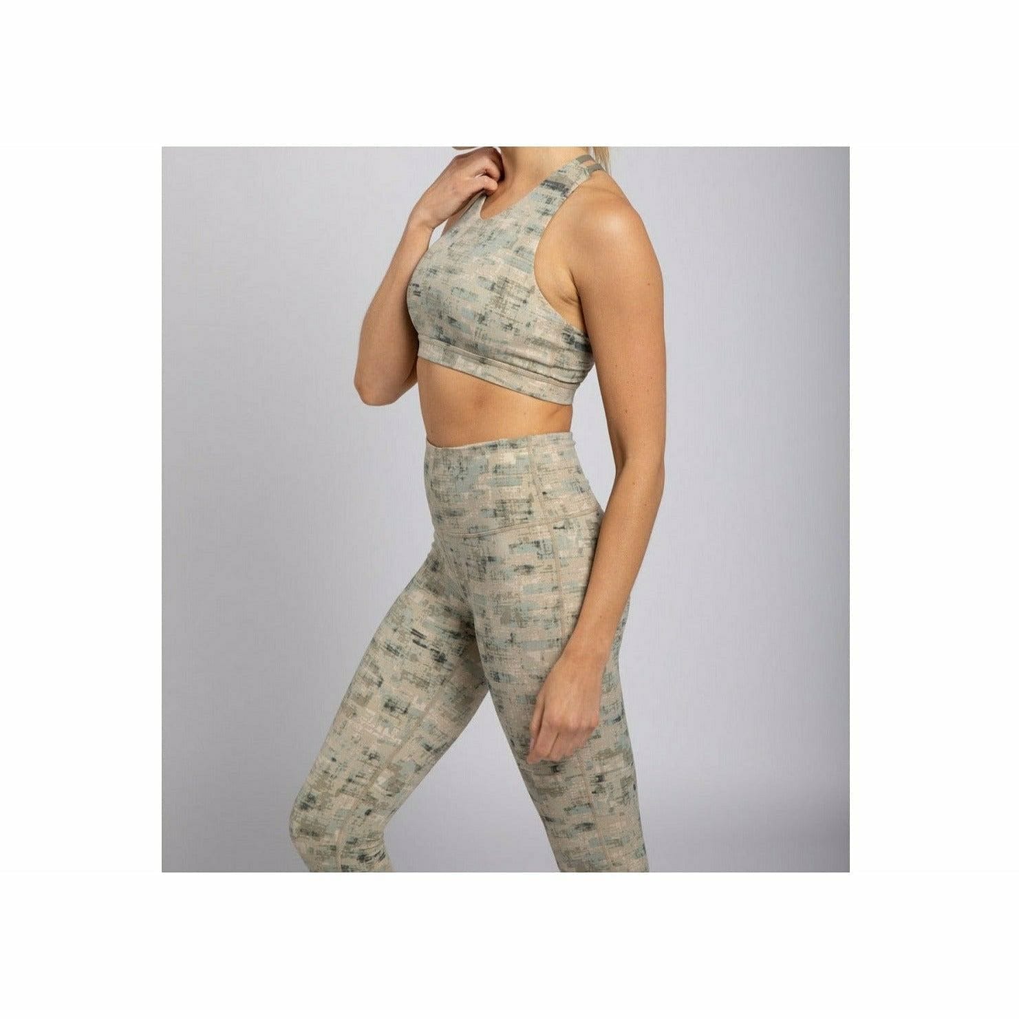 This all-over stucco print this sports bra has a strappy criss-cross back and a higher neckline paired with high-waisted leggings have an all-over abstract stucco-like print and offer ab support.